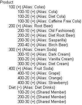 Diet has a tilde (~) operator, which indicates that Essbase does not include the Diet member in the consolidation to the parent, Product. The Diet member consists entirely of members that are shared. The TBC product management group wants to be able to isolate Diet drinks in reports, so TBC created a separate Diet member that does not impact overall consolidation.