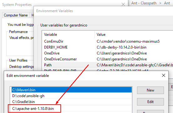 - Add ANT_HOME/bin to your PATH environment variable. Ex for a windows environment variable: