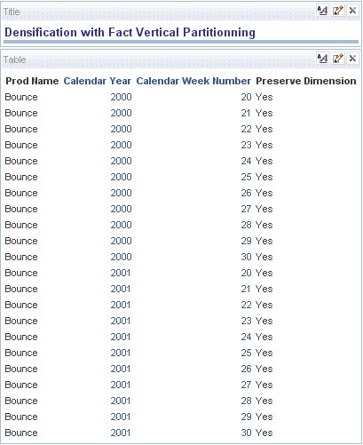 A typical situation in the sh schema with a sparse dimension is shown in the following example, which computes the weekly sales and year-to-date sales for the product Bounce for weeks 20-30 in 2000 and 2001: