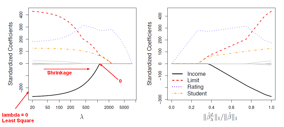 In the case of the lasso, the <math>l_1</math> penalty has the effect of forcing some of the coefficient estimates to be exactly equal to zero when the tuning_parameter <math>\lambda</math> is sufficiently large (whereas it's not the case with ridge regression)