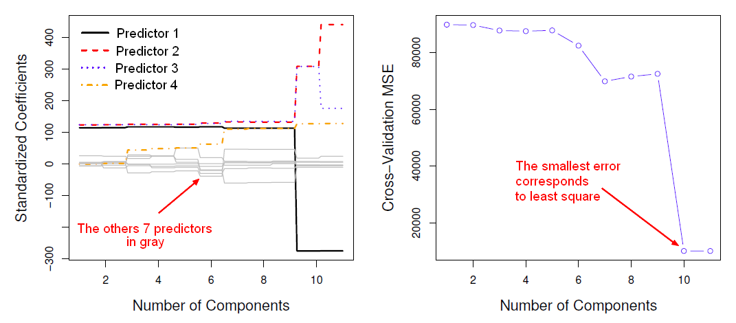 - With 11 components, we got the full least squares model because when m equals p this is regular least squares on the original data.