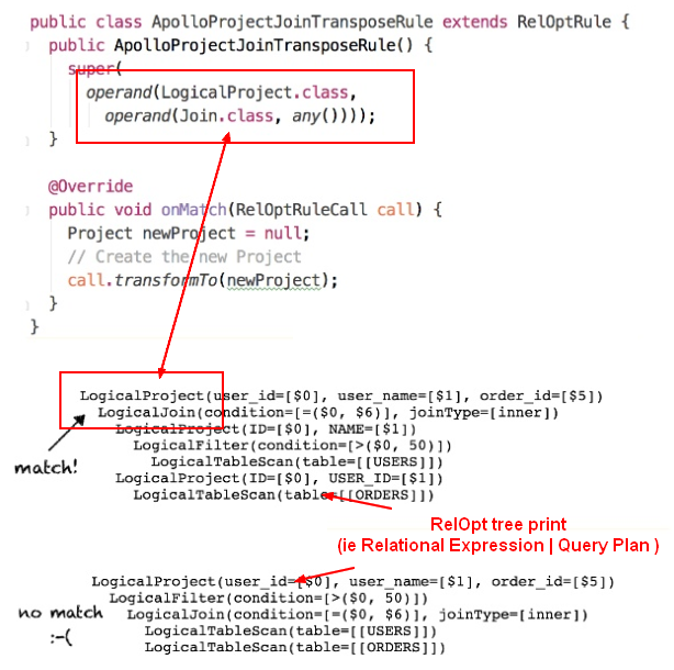 Match: Transformer Rules are matched to elements of a query plan using pattern matching. onMatch is called for matched rules
