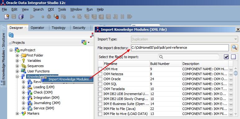 - Specify the Import Directory , and select one or more Knowledge Module Files to Import from this directory