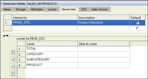 - there is only one hierarchy, PROD_STD, with levels arranged in a particular order (top down in the panel list).