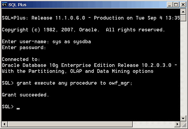 Finally, you need to grant the “EXECUTE ANY PROCEDURE” privilege to the owf_mgr user. Connect to SQL Plus as “SYS as sysdba”, and issue the command: grant execute any procedure to owf_mgr
