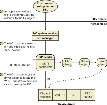 The I/O request packet (IRP) is where the I/O system stores information it needs to process an I/O request. When a thread calls an I/O API, the I/O manager constructs an IRP to represent the operation as it progresses through the I/O system.