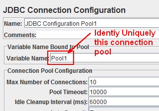 - A JDBC Request with the same pool name than the configuration (Pool1) and with Variables