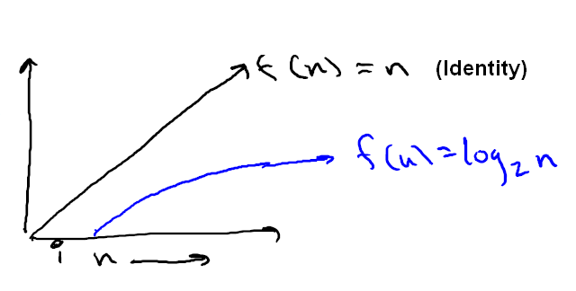The logarithm is much, much smaller than the input. log is running much, much, much slower than the identity function. <MATH> \begin{array}{rrl} log_2 (10) & \approx & 3 \\ log_2 (100) & \approx & 7 \\ log_2 (1000) & \approx & 10 \\ \end{array} </MATH>