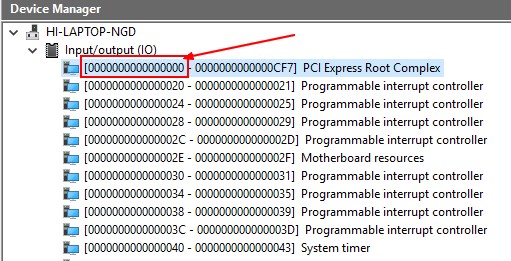 You can view memory mappings by opening the device manager, clicking view, and then resources by type.