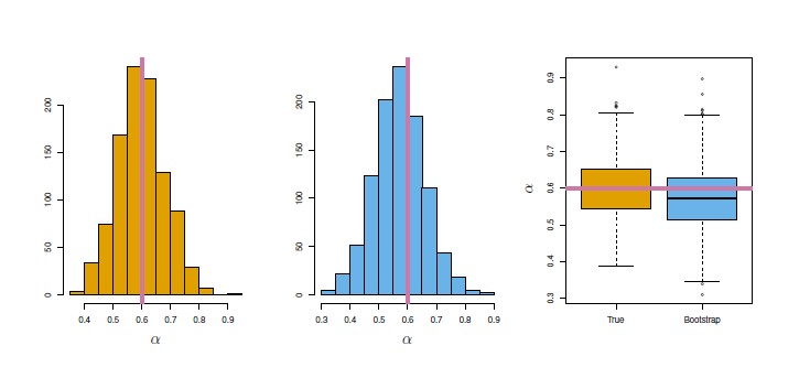 - Center: A sampling distribution of the estimates of the estimator alpha obtained from 1,000 bootstrap samples from a single data set. See below