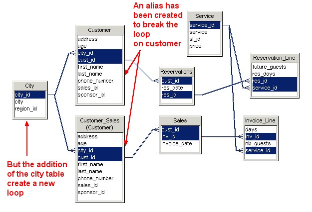 The only way to resolve this loop is to leave the loop in place, and create a context that specifies one or the other path around the schema. This ensures that queries answer questions for one transaction or the other, such as: Is the customer information needed from the perspective of sales or reservations?