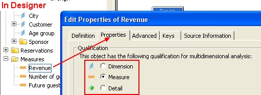 Dimension objects provide the basis for analysis in a report. Dimension objects typically retrieve character-type data (customer names, city names, etc.), or dates (years, quarters, invoice dates, etc.)